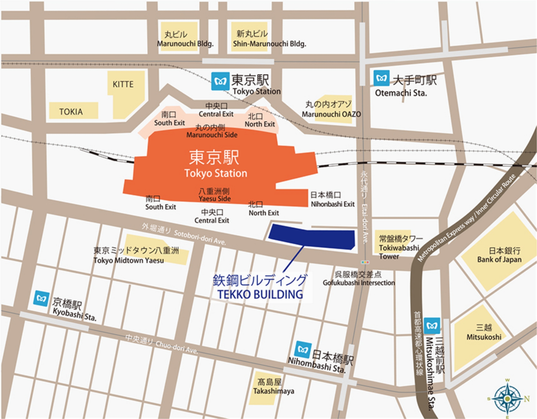 東京駅八重洲北口または日本橋口から徒歩2分、地下鉄大手町駅B10出口直結